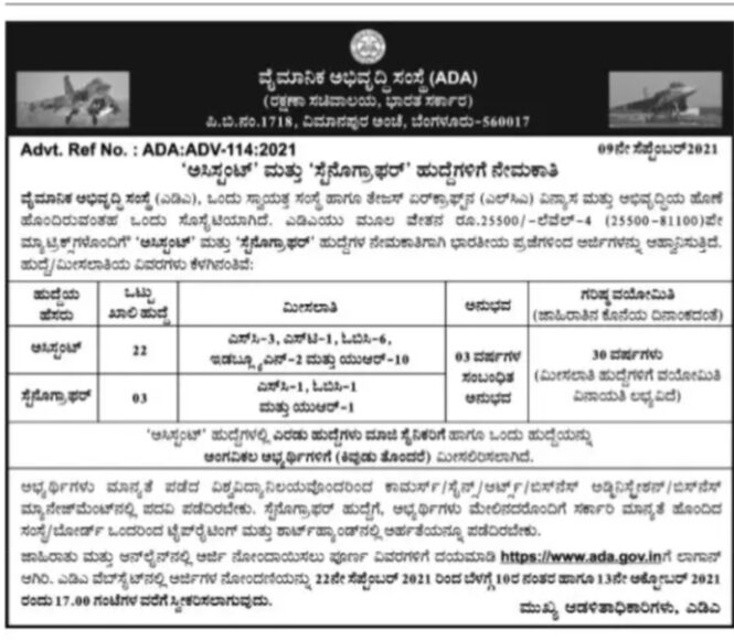 ವೈಮಾನಿಕ ಅಭಿವೃದ್ಧಿ ಸಂಸ್ಥೆ (ADA), ಒಂದು ಸ್ವಾಯತ್ತ ಸಂಸ್ಥೆ. ಇಲ್ಲಿ ಖಾಲಿ ಇರುವ ಹುದ್ದೆಗೆ ಅರ್ಜಿಯನ್ನು ಆಹ್ವಾನಿಸಲಾಗಿದೆ. ಆಸಕ್ತರು ಅರ್ಜಿಯನ್ನು ಸಲ್ಲಿಸಬಹುದಾಗಿದೆ. ಹುದ್ದೆ : ಅಸಿಸ್ಟೆಂಟ್- 22 ಹುದ್ದೆಸ್ಟೆನೋಗ್ರಾಫರ್ – 03 ಹುದ್ದೆ ವಯೋಮಿತಿ : 30 ವರ್ಷ ಅಸಿಸ್ಟೆಂಟ್ ಹುದ್ದೆಗಳಲ್ಲಿ ಎರಡು ಹುದ್ದೆಗಳು ಮಾಜಿ ಸೈನಿಕರಿಗೆ ಹಾಗೂ ಒಂದು ಹುದ್ದೆಯನ್ನು ಅಂಗವಿಕಲ ಅಭ್ಯರ್ಥಿಗಳಿಗೆ ಮೀಸಲಿಡಲಾಗಿದೆ. ಅಭ್ಯರ್ಥಿಗಳು ಮಾನ್ಯತೆ ಪಡೆದ ವಿಶ್ವವಿದ್ಯಾನಿಲಯವೊಂದರಿಂದ ಕಾಮರ್ಸ್/ ಸೈನ್ಸ್/ ಆರ್ಟ್ಸ್/ ಬಿಸ್ ನೆಸ್ ಅಡ್ಮಿನಿಸ್ಟ್ರೇಶನ್/ ಬಿಸ್ ನೆಸ್ ಮ್ಯಾನೇಜ್ಮೆಂಟ್ ನಲ್ಲಿ ಪದವಿ […]