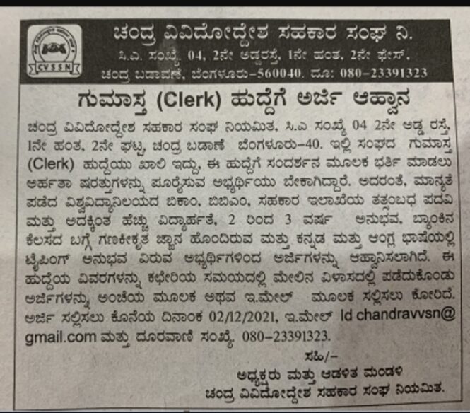 ಚಂದ್ರ ವಿವಿದೋದ್ದೇಶ ಸಹಕಾರ ಸಂಘ ನಿಯಮಿತ, ಬೆಂಗಳೂರು ಇಲ್ಲಿ ಸಂಘದ ಗುಮಾಸ್ತ ಹುದ್ದೆಯು ಖಾಲಿ ಇದ್ದು, ಈ ಹುದ್ದೆಗೆ ಸಂದರ್ಶನ ಮೂಲಕ ಭರ್ತಿ ಮಾಡಲು ಅರ್ಹತಾ ಷರತ್ತುಗಳನ್ನು ಪೂರೈಸುವ ಅಭ್ಯರ್ಥಿಯು ಬೇಕಾಗಿದ್ದಾರೆ. ವಿದ್ಯಾರ್ಹತೆ : ಮಾನ್ಯತೆ ಪಡೆದ ವಿಶ್ವವಿದ್ಯಾನಿಲಯದ ಬಿಕಾಂ, ಬಿಬಿಎಂ, ಸಹಕಾರ ಇಲಾಖೆಯ ತತ್ಸಂಬಧ ಪದವಿ ಮತ್ತು ಅದಕ್ಕಿಂತ ಹೆಚ್ಚು ವಿದ್ಯಾರ್ಹತೆ. 2 ರಿಂದ 3 ವರ್ಷ ಅನುಭವ. ಬ್ಯಾಂಕಿನ ಕೆಲಸದ ಬಗ್ಗೆ ಗಣಕೀಕೃತ ಜ್ಞಾನ ಹೊಂದಿರುವ ಮತ್ತು ಕನ್ನಡ ಮತ್ತು ಆಂಗ್ಲಭಾಷೆಯಲ್ಲಿ ಟೈಪಿಂಗ್ ಅನುಭವವಿರುವ […]