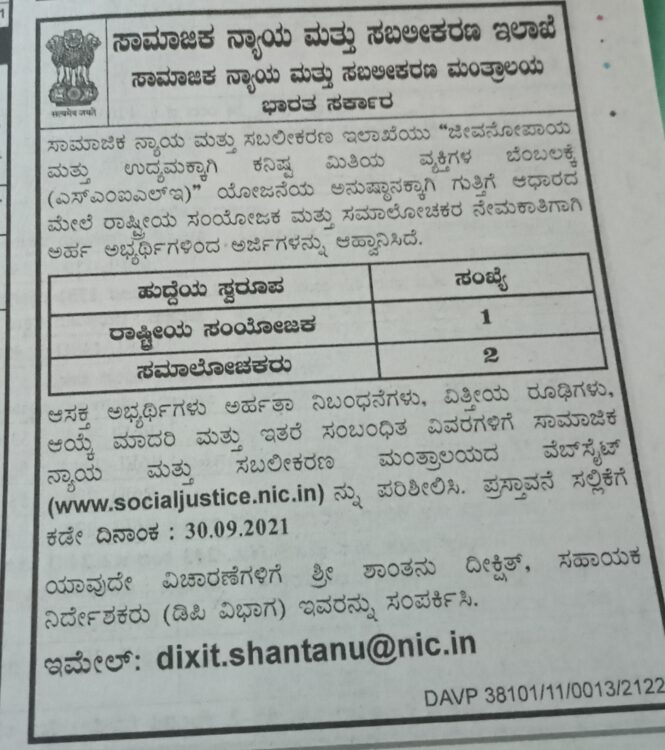 ಸಾಮಾಜಿಕ ನ್ಯಾಯ ಮತ್ತು ಸಬಲೀಕರಣ ಇಲಾಖೆಯು ” ಜೀವನೋಪಾಯ ಮತ್ತು ಉದ್ಯಮಕ್ಕಾಗಿ ಕನಿಷ್ಟ ಮಿತಿಯ ವ್ಯಕ್ತಿಗಳ ಬೆಂಬಲಕ್ಕೆ ( ಎಸ್ ಎಂಐಎಲ್ ಇ) ” ಯೋಜನೆಯ ಅನುಷ್ಠಾನಕ್ಕಾಗಿ ಗುತ್ತಿಗೆ ಆಧಾರದ ಮೇಲೆ ರಾಷ್ಟ್ರೀಯ ಸಂಯೋಜಕ ಮತ್ತು ಸಮಾಲೋಚಕರ ನೇಮಕಾತಿಗಾಗಿ ಅರ್ಹ ಅಭ್ಯರ್ಥಿಗಳಿಂದ ಅರ್ಜಿಗಳನ್ನು ಆಹ್ವಾನಿಸಿದೆ. ಹುದ್ದೆಯ ವಿವರ : ರಾಷ್ಟ್ರೀಯ ಸಂಯೋಜಕ – 1 ಸಂಖ್ಯೆಸಮಾಲೋಚಕರು – 2 ಸಂಖ್ಯೆ ಆಸಕ್ತ ಅಭ್ಯರ್ಥಿಗಳು ಅರ್ಹತಾ ನಿಬಂಧನೆಗಳು, ವಿತ್ತೀಯ ರೂಢಿಗಳು, ಆಯ್ಕೆ ಮಾದರಿ ಮತ್ತು ಇತರೆ ಸಂಬಂಧಿತ ವಿವರಗಳಿಗೆ […]