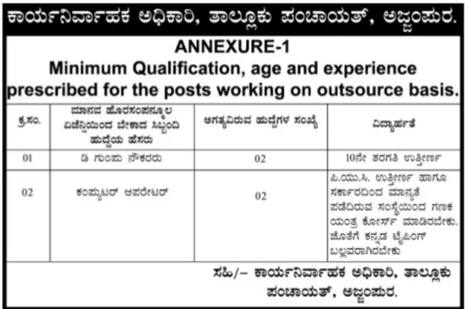ಚಿಕ್ಕಮಗಳೂರು ಜಿಲ್ಲೆಯ ಅಜ್ಜಂಪುರ ತಾಲ್ಲೂಕ್ ಪಂಚಾಯತ್ನಲ್ಲಿ ಖಾಲಿ ಇರುವ ಕಂಪ್ಯೂಟರ ಆಪರೇಟರ್ ಹಾಗೂ ಡಿ.ಗುಂಪು ನೌಕರರು ಹುದ್ದೆಗಳನ್ನು ಭರ್ತಿ ಮಾಡಲು ಅರ್ಜಿಯನ್ನು ಆಹ್ವಾನಿಸಿದೆ.