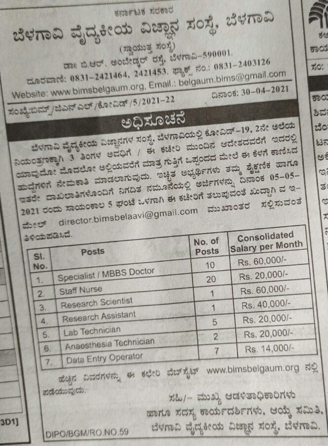 ಬೆಳಗಾವಿ ವೈದ್ಯಕೀಯ ವಿಜ್ಞಾನಗಳ ಸಂಸ್ಥೆ, ಬೆಳಗಾವಿಯಲ್ಲಿ ಕೋವಿಡ್ 19 , ಎರಡನೇ ಅಲೆಯ ನಿಯಂತ್ರಣಕ್ಕಾಗಿ ಮೂರು ತಿಂಗಳ ಅವಧಿಗೆ / ಈ ಕಚೇರಿ ಮುಂದಿನ ಆದೇಶದವರೆಗೆ ಇದರಲ್ಲಿ ಯಾವುದು ಮೊದಲೋ ಅಲ್ಲಿಯವರೆಗೆ ಮಾತ್ರ ಗುತ್ತಿಗೆ ಒಪ್ಪಂದದ ಮೇಲೆ ಈ ಕೆಳಗೆ ಕಾಣಿಸಿದ ಹುದ್ದೆಗಳಿಗೆ ನೇಮಕಾತಿ ಮಾಡಲಾಗುವುದು. ಆಸಕ್ತಿ ಇರುವ ಅಭ್ಯರ್ಥಿಗಳು ಅರ್ಜಿಯನ್ನು ದಿನಾಂಕ 05-05-2021 ರ 5.00 ಗಂಟೆಯೊಳಗೆ ಇ-ಮೇಲ್ ಮೂಲಕ ಸಲ್ಲಿಸಬೇಕು : [email protected] ಗೆ ಸಲ್ಲಿಸತಕ್ಕದ್ದು.