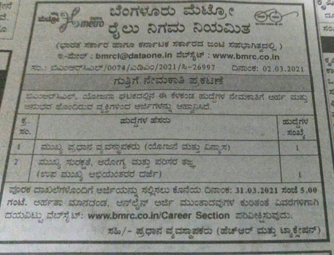 ಬಿಎಂಆರ್ ಸಿಎಲ್, ಯೋಜನಾ ಘಟಕದಲ್ಲಿನ ಈ ಕೆಳಕಂಡ ಹುದ್ದೆಗಳ ನೇಮಕಾತಿಗೆ ಅರ್ಹ ಮತ್ತು ಅನುಭವ ಹೊಂದಿರುವ ಅಭ್ಯರ್ಥಿಗಳಿಂದ ಅರ್ಜಿ ಆಹ್ವಾನಿಸಿಸಲಾಗಿದೆ. ಹೆಚ್ಚಿನ ಮಾಹಿತಿಗಾಗಿ ಮುಂದೆ ಓದಿ