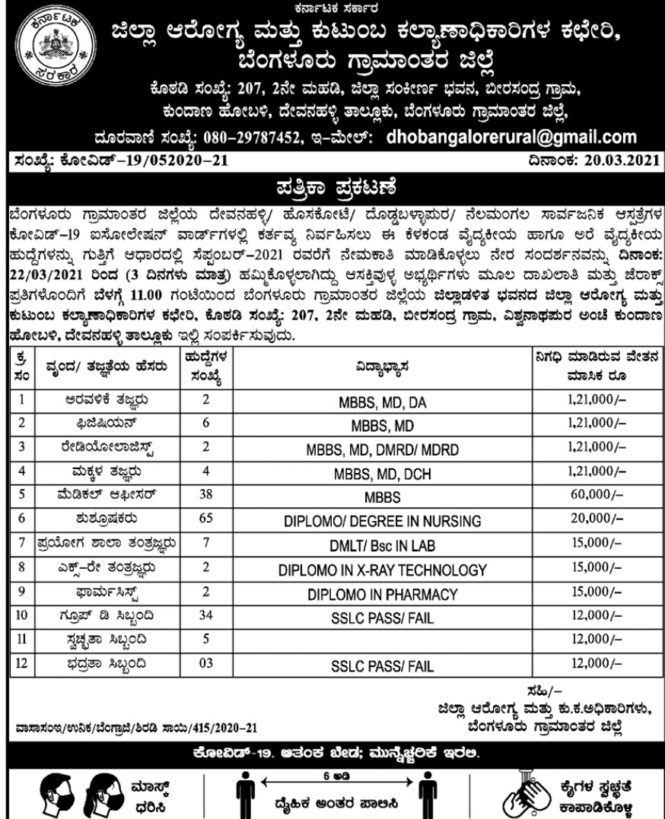 ಬೆಂಗಳೂರು ಗ್ರಾಮಾಂತರ ಜಿಲ್ಲೆಯ ದೇವನಹಳ್ಳಿ/ಹೊಸಕೋಟೆ/ದೊಡ್ಡಬಳ್ಳಾಫುರ/ನೆಲಮಂಗಲ ಸಾರ್ವಜನಿಕ ಆಸ್ಪತ್ರೆಗಳ ಕೋವಿಡ್ -19 ಐಸೋಲೇಶನ್ ವಾರ್ಡ್ಗಳಲ್ಲಿ ಕರ್ತವ್ಯ ನಿರ್ವಹಿಸಲು ಈ ಕೆಳಕಂಡ ವೈದ್ಯಕೀಯ ಹಾಗೂ ಅರೆ ವೈದ್ಯಕೀಯ ಹುದ್ದೆಗಳನ್ನು ಗುತ್ತಿಗೆ ಆಧಾರದಲ್ಲಿ ಸೆಪ್ಪೆಂಬರ್ 2021 ರವರೆಗೆ ನೇಮಕಾತಿ ಮಾಡಿಕೊಳ್ಳಲು ನೇರ ಸಂದರ್ಶನವನ್ನು ದಿನಾಂಕ 22/03/2021 ರಿಂದ (3 ದಿನಗಳು ಮಾತ್ರ) ಹಮ್ಮಿಕೊಳ್ಳಲಾಗಿದ್ದು ಆಸಕ್ತಿವುಳ್ಳ ಅಭ್ಯರ್ಥಿಗಳು ಮೂಲ ದಾಖಲಾತಿ ಮತ್ತು ಜೆರಾಕ್ಸ್ ಪ್ರತಿಗಳೊಂದಿಗೆ ಬೆಳಗ್ಗೆ 11.೦೦ ಗಂಟೆಯಿಂದ ಬೆಂಗಳೂರು ಗ್ರಾಮಾಂತರ ಜಿಲ್ಲೆಯ ಆಡಳಿತ ಭವನದ ಜಿಲ್ಲಾಆರೋಗ್ಯ ಮತ್ತು ಕುಟುಂಬ ಕಲ್ಯಾಣಾಧಿಕಾರಿಗಳ ಕಛೇರಿ, ಕೊಠಡಿ ಸಂಖ್ಯೆ -207, 2ನೇ ಮಹಡಿ, ಬೀರಸಂದ್ರ ಗ್ರಾಮ, ವಿಶ್ವನಾಥಪುರ ಅಂಚೆ ಕುಂದಾಣ ಹೋಬಳಿ, ದೇವನಹಳ್ಳಿ ತಾಲ್ಲೂಕು ಇಲ್ಲಿ ಸಂಪರ್ಕಿಸುವುದು.