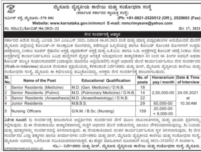ಮಾನ್ಯ ಜಿಲ್ಲಾಧಿಕಾರಿಗಳ ಅನುಮೋದನೆ ಮೇರೆಗೆ ಮೈಸೂರು ಜಿಲ್ಲೆಯಲ್ಲಿ ಕೋವಿಡ್ -19 ಸಾಂಕ್ರಾಮಿಕ ರೋಗವನ್ನು ತಡೆಗಟ್ಟುವ ಹಿನ್ನೆಲೆಯಲ್ಲಿ ಹಾಗೂ ಕೋವಿಡ್ ಸೋಂಕಿತ ರೋಗಿಗಳಿಗೆ ಉತ್ತಮ ಚಿಕಿತ್ಸೆಯನ್ನು ನೀಡಲು ಸೂಪರ್ ಸ್ಪೆಷಾಲಿಟಿ ಆಸ್ಪತ್ರೆ, ಟ್ರಾಮಾಕೇರ್ ಆಸ್ಪತ್ರೆ ಮತ್ತು ಪಿಕೆಟಿಬಿ ಹಾಗೂ ಸಿಡಿ ಆಸ್ಪತ್ರೆಗಳಲ್ಲಿ ಕೋವಿಡ್ ಚಿಕಿತ್ಸೆ ನೀಡಲು ಸದರಿ ಆಸ್ಪತ್ರೆಗಳಲ್ಲಿ ಕಾರ್ಯನಿರ್ವಹಿಸಲು ವಿವಿಧ ಹುದ್ದೆಗಳಿಗೆ ವೈದ್ಯರ ಅಗತ್ಯತೆ ಇರುವುದರಿಂದ ತಾತ್ಕಾಲಿಕವಾಗಿ 03 ರಿಂದ 06 ತಿಂಗಳ ಅವಧಿಗೆ ಅಥವಾ ಕೋವಿಡ್ ಪರಿಸ್ಥಿತಿ ಸುಧಾರಿಸುವವರೆಗೆ (ಯಾವುದು ಮೊದಲೋ ಅಲ್ಲಿಯವರೆಗೆ) ಗುತ್ತಿಗೆ ಆಧಾರದ ಮೇಲೆ ಕಾರ್ಯನಿರ್ವಹಿಸಲು ನೇರ ಸಂದರ್ಶನದ ಮೂಲಕ ನೇಮಕಾತಿ ಪ್ರಕ್ರಿಯೆಯನ್ನು ಕೆಳಕಂಡಂತೆ ನಿರ್ದೇಶಕರು ಮತ್ತು ಡೀನ್, ಮೈಸೂರು ವೈದ್ಯಕೀಯ ಕಾಲೇಜು ಮತ್ತು ಸಂಶೋಧನಾ ಸಂಸ್ಥೆ, ಮೈಸೂರು ಈ ಕಚೇರಿಯಲ್ಲಿ ಹಮ್ಮಿಕೊಂಡಿದ್ದು, ಆಸಕ್ತರು ನೇರ ಸಂದರ್ಶನಕ್ಕೆ ಹಾಜರಾಗಬಹುದು.