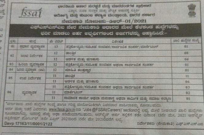 ಅರ್ಜಿ ಮತ್ತು ಇತರೆ ವಿವರಗಳು www.fssai.gov.in ರಡಿ jobs @FSSAI ( Carers) Sectionರಲ್ಲಿ ಲಭ್ಯ.