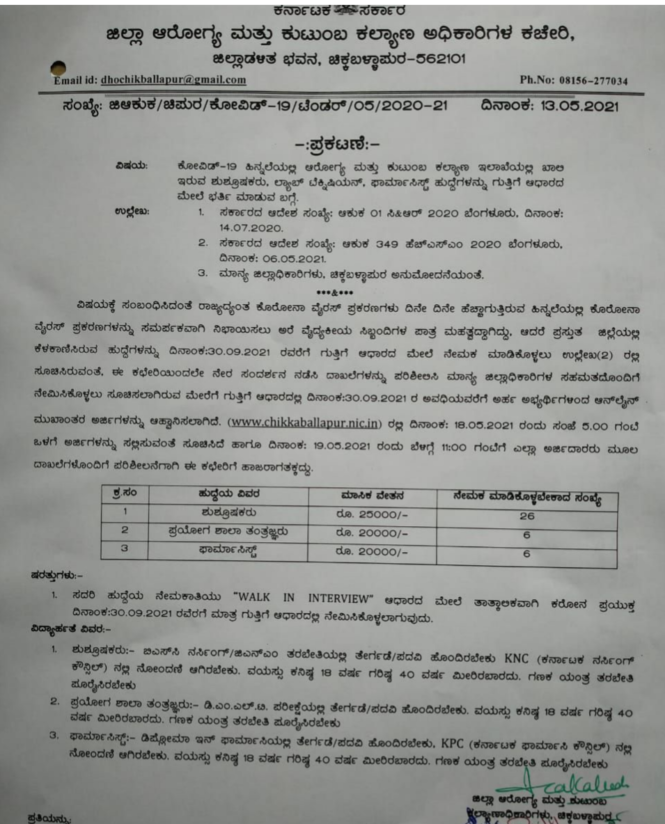 ದಿನಾಂಕ 30-09-2021ರ ಅವಧಿಯವರೆಗೆ ಅರ್ಹ ಅಭ್ಯರ್ಥಿಗಳಿಂದ ಆನ್ಲೈನ್ ಮುಖಾಂತರ ಅರ್ಜಿಗಳನ್ನು ಆಹ್ವಾನಿಸಲಾಗಿದೆ. (www.chikkaballapur.nic.in) ರಲ್ಲಿ ದಿನಾಂಕ 18-05-2021 ರಂದು ಸಂಜೆ 05-00 ಗಂಟೆ ಒಳಗೆ ಅರ್ಜಿಗಳನ್ನು ಸಲ್ಲಿಸುವಂತೆ ಸೂಚಿಸಿದೆ. ಹಾಗೂ ದಿನಾಂಕ 19-05-2021 ರಂದು ಬೆಳಿಗ್ಗೆ 11.00 ಗಂಟೆಗೆ ಎಲ್ಲಾ ಅರ್ಜಿದಾರರು ಮೂಲ ದಾಖಲೆಗಳೊಂದಿಗೆ ಪರಿಶೀಲನೆ ಗಾಗಿ ಕಚೇರಿಗೆ ಬರತಕ್ಕದ್ದು.