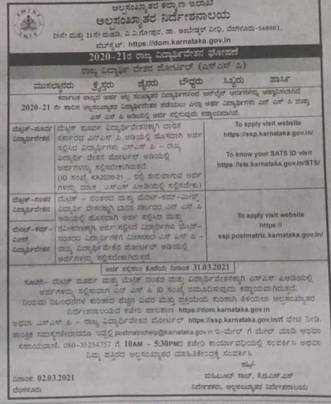 ಮೆಟ್ರಿಕ್ ಪೂರ್ವ ಮೆಟ್ರಿಕ್ ನಂತರ ವಿದ್ಯಾರ್ಥಿ ವೇತನಕ್ಕಾಗಿ ಎಸ್ಎಸ್ ಪಿ ಅಡಿಯಲ್ಲಿ ಅರ್ಜಿ ಸಲ್ಲಿಸುವಾಗ ಎನ್ ಎಸ್ ಪಿ ID ಸಂಖ್ಯೆ ನಮೂದಿಸುವುದು ಕಡ್ಡಾಯವಾಗಿರುತ್ತದೆ. ನಿಯಮ ನಿಬಂಧನೆಗಳ ಕುರಿತಾದ ಹೆಚ್ಚಿನ ವಿವರ ಮತ್ತು ಪ್ರಕ್ರಿಯೆಯ ಕುರಿತಾಗಿ ತಿಳಿಯಲು ಅಲ್ಪಸಂಖ್ಯಾತರ ನಿರ್ದೇಶನಾಲಯದ ಕಚೇರಿ ಜಾಲತಾಣ https://dom.Karnataka.gov.in ಅಥವಾ ಎಸ್ ಎಸ್ ಪಿ ರಾಜ್ಯ ವಿದ್ಯಾರ್ಥಿ ವೇತನ ಪೋರ್ಟಲ್ https:/ssp.Karnataka.gov.in/ ಗೆ ಭೇಟಿ ನೀಡಬಹುದು.