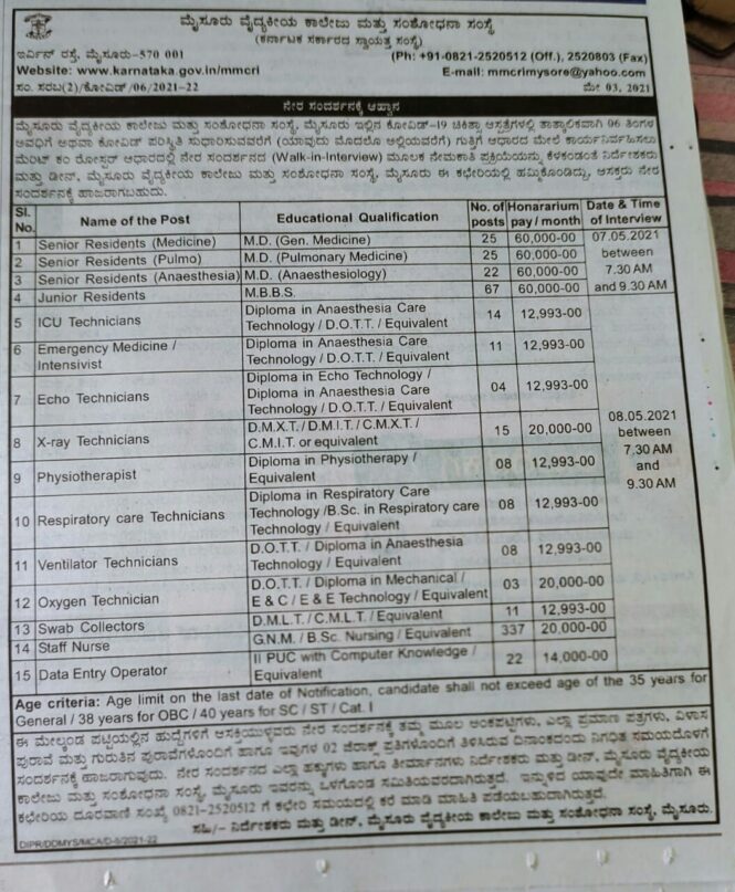 ಮೈಸೂರು ವೈದ್ಯಕೀಯ ಕಾಲೇಜು ಮತ್ತು ಸಂಶೋಧನಾ ಸಂಸ್ಥೆ, ಮೈಸೂರು ಇಲ್ಲಿ ಚಿಕಿತ್ಸಾ ಆಸ್ಪತ್ರೆಗಳಲ್ಲಿ 06 ತಿಂಗಳ ಅವಧಿಗೆ ಅಥವಾ ಕೋವಿಡ್ ಪರಿಸ್ಥಿತಿ ಸುಧಾರಿಸುವವರೆಗರ ಮೂಲಕ ನೇಮಕಾತಿ ಪ್ರಕ್ರಿಯೆಯನ್ನು ಮಾಡಲು ಅರ್ಜಿಯನ್ನು ಆಹ್ವಾನಿಸಲಾಗಿದೆ.