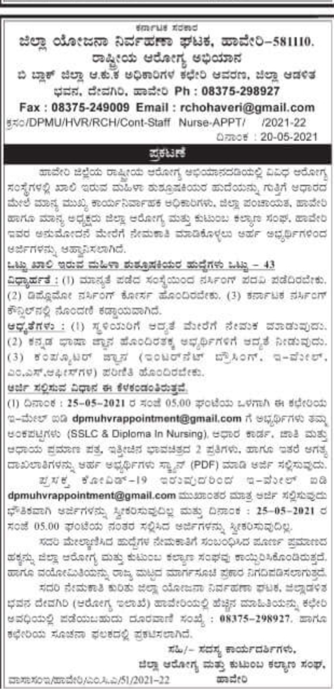 ಹಾವೇರಿ ಜಿಲ್ಲೆಯ ರಾಷ್ಟ್ರೀಯ ಆರೋಗ್ಯ ಅಭಿಯಾನದಡಿಯಲ್ಲಿ ವಿವಿಧ ಆರೋಗ್ಯ ಸಂಸ್ಥೆಗಳಲ್ಲಿ ಖಾಲಿ ಇರುವ ಮಹಿಳಾ ಶುಶ್ರೂಷಕಿಯರ ಹುದ್ದೆಯನ್ನು ಗುತ್ತಿಗೆ ಆಧಾರದ ಮೇಲೆ ಮುಖ್ಯ ಕಾರ್ಯ ನಿರ್ವಾಹಕ ಅಧಿಕಾರಿಗಳು, ಜಿಲ್ಲಾ ಪಂಚಾಯತ ಹಾವೇರಿ ಹಾಗೂ ಮಾನ್ಯ ಅಧ್ಯಕ್ಷರು ಜಿಲ್ಲಾ ಆರೋಗ್ಯ ಮತ್ತು ಕುಟುಂಬ ಕಲ್ಯಾಣ ಸಂಘ, ಹಾವೇರಿ ಇವರ ಅನುಮೋದನೆ ಮೇರೆಗೆ ನೇಮಕಾತಿ ಮಾಡಿಕೊಳ್ಳಲು ಅರ್ಹ ಅಭ್ಯರ್ಥಿಗಳಿಂದ ಅರ್ಜಿಗಳನ್ನು ಆಹ್ವಾನಿಸಲಾಗಿದೆ.