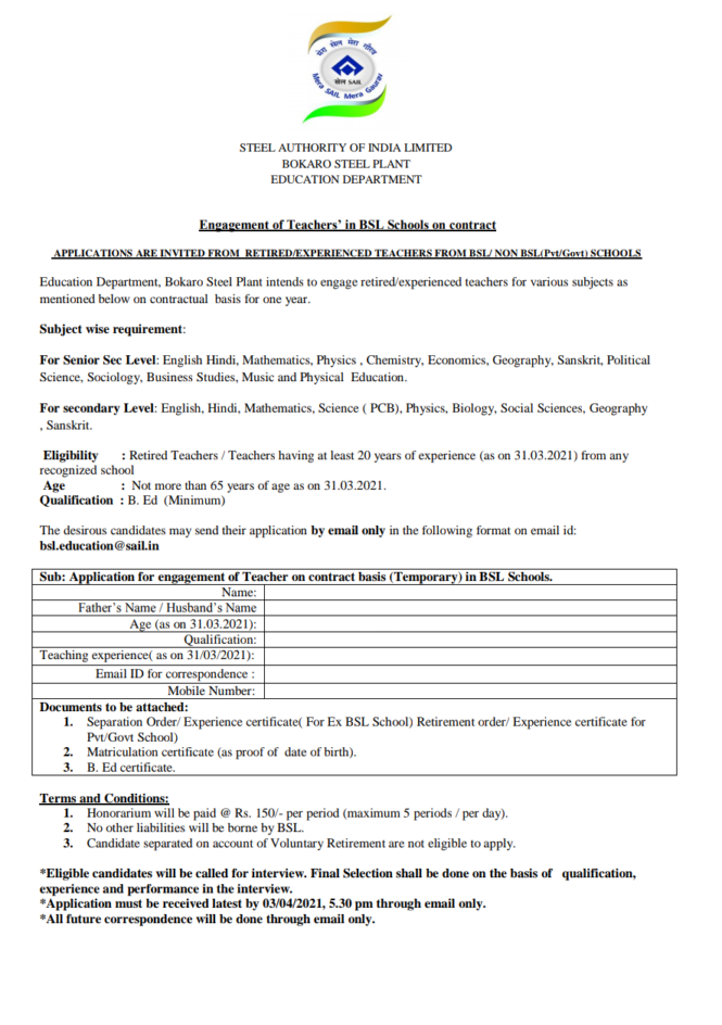 ಸ್ಟೀಲ್ ಅಥಾರಟಿ ಆಫ್ ಇಂಡಿಯಾ (ಎಸ್ ಎಐಎಲ್) ನಲ್ಲಿ ವಿವಿಧ ಹುದ್ದೆಗಳಿದ್ದು, ಅರ್ಹ ಅಭ್ಯರ್ಥಿಗಳಿಂದ ಅರ್ಜಿ ಆಹ್ವಾನಿಸಲಾಗಿದೆ. ಅರ್ಜಿ ಸಲ್ಲಿಕೆ ಪ್ರಕ್ರಿಯೆ ಈಗಾಗಲೇ ಆರಂಭವಾಗಿದ್ದು, ಸಲ್ಲಿಸಲು ಎಪ್ರಿಲ್ 03 ಕೊನೆಯ ದಿನಾಂಕವಾಗಿದೆ. ಒಟ್ಟು ಹುದ್ದೆಗಳ ವಿವರ, ವಿದ್ಯಾರ್ಹತೆ, ಅರ್ಜಿ ಸಲ್ಲಿಸುವ ವಿಧಾನ, ಅರ್ಜಿ ಶುಲ್ಕ ಇತ್ಯಾದಿ ವಿವರಗಳನ್ನು ಮುಂದೆ ನೀಡಲಾಗಿದೆ.