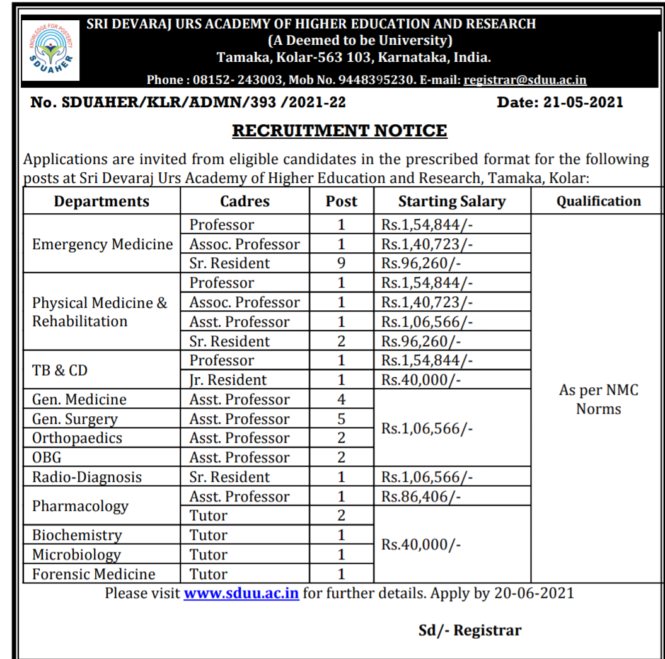 ಅರ್ಜಿ ಸಲ್ಲಿಸುವ ವಿಳಾಸ : Office Of the human resources management, SDUAHER, Tamaka, Kolar-563103