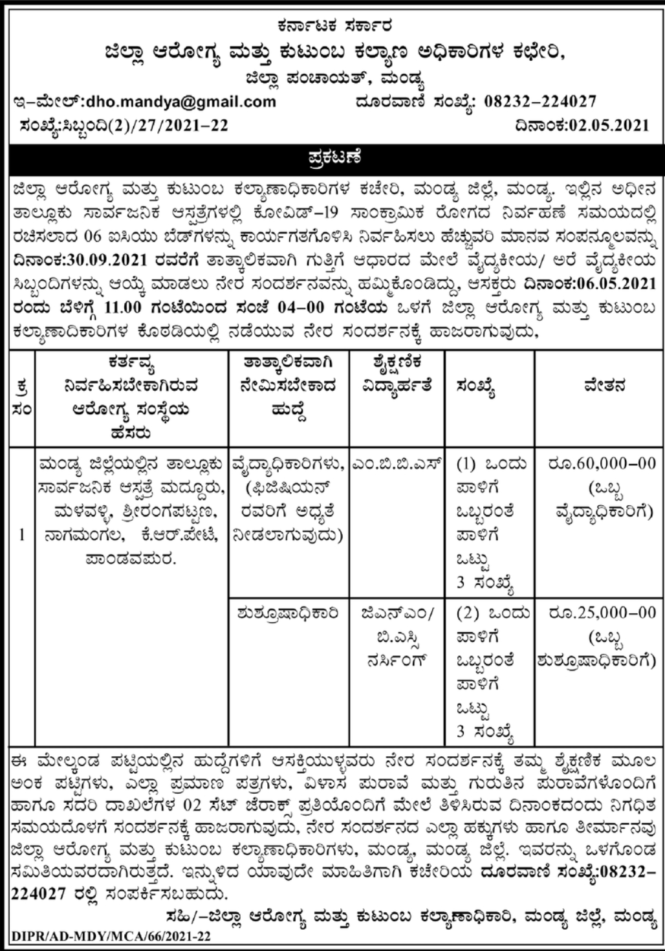 ಜಿಲ್ಲಾ ಆರೋಗ್ಯ ಮತ್ತು ಕುಟುಂಬ ಕಲ್ಯಾಣಾಧಿಕಾರಿಗಳ ಕಚೇರಿ, ಮಂಡ್ಯ ಜಿಲ್ಲೆ ಮಂಡ್ಯ ಇಲ್ಲಿನ ಅಧೀನ ತಾಲ್ಲೂಕು ಸಾರ್ವಜನಿಕ ಆಸ್ಪತ್ರೆಗಳಲ್ಲಿ ಕೋವಿಡ್ -19 ಸಾಂಕ್ರಾಮಿಕ ರೋಗದ ನಿರ್ವಹಣೆ ಸಮಯದಲ್ಲಿ ರಚಿಸಲಾದ 06 ಐಸಿಯು ಬೆಡ್ ಗಳನ್ನು ಕಾರ್ಯಗತಗೊಳಿಸಿ ನಿರ್ವಹಿಸಲು ಹೆಚ್ಚುವರಿ ಮಾನವ ಸಂಪನ್ಮೂಲವನ್ನು ದಿನಾಂಕ 30-09-2021 ರವರೆಗೆ ತಾತ್ಕಾಲಿಕವಾಗಿ ಗುತ್ತಿಗೆ ಆಧಾರದ ಮೇಲೆ ವೈದ್ಯಕೀಯ / ಅರೆ ವೈದ್ಯಕೀಯ ಸಿಬ್ಬಂದಿಗಳನ್ನು ಆಯ್ಕೆ ಮಾಡಲು ನೇರ ಸಂದರ್ಶನವನ್ನು ಹಮ್ಮಿಕೊಂಡಿದ್ದು, ಆಸಕ್ತರು ದಿನಾಂಕ 06-05-2021 ರಂದು ಬೆಳಿಗ್ಗೆ 11.00 ಗಂಟೆಯಿಂದ ಸಂಜೆ 04-00 ಗಂಟೆಯ ಒಳಗೆ ಜಿಲ್ಲಾ ಆರೋಗ್ಯ ಮತ್ತು ಕುಟುಂಬ ಕಲ್ಯಾಣಾಧಿಕಾರಿಗಳ ಕೊಠಡಿಯಲ್ಲಿ ನಡೆಯುವ ನೇರ ಸಂದರ್ಶನಕ್ಕೆ ಹಾಜರಾಗುವುದು.